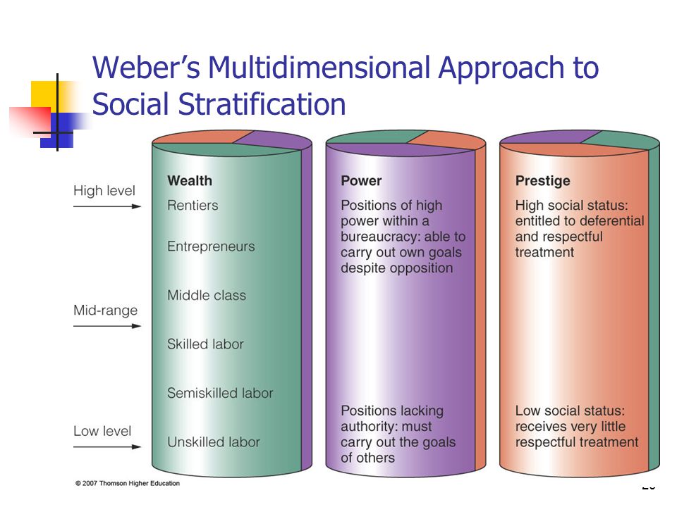 Marx understood that class was more complicated than just Bourgeoisie and Proletariat.1 Weber, on the other hand, saw class as based on three different dimensions. According to Weberโs Multidimensional Theory of Social Stratification, oneโs position in society is based not just on Class, or the ability to gain material goods and increase life chances and satisfaction, but also Status, based on lifestyle, education, heredity and/or occupation as well as Power or the ability to get what you want despite opposition, which usually involved forming relationships with others, or Parties. (fig 3.)