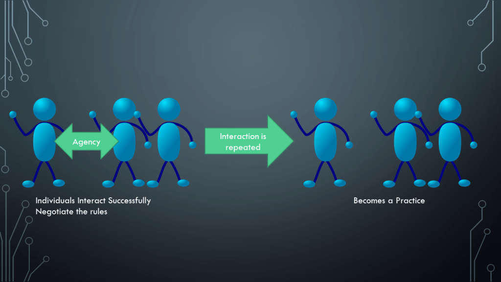 Another aspect of the Duality of Structure is that structures are both enabling and constraining of human agency. Schools make it easy and efficient to become educated and earn the credentials of an educated person. If a person wants to be considered educated, they can choose to go through a schooling structure. However, other options, say reading all of the books in your local library, are not available for becoming educated. You may gain knowledge, but you cannot gain the credentials, or the recognition as an educated person without going through the accepted structures. So individuals have choices, but those choices are limited by the available structures.