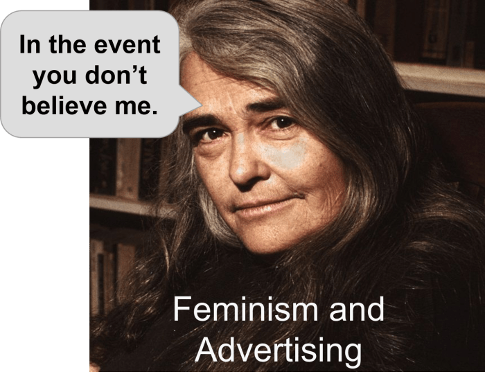 Marxist Feminists expand on this analysis. Marxist Feminists see sexual and gender inequality as a characteristic of capitalism itself. Marxist Feminists look at how women’s labor is exploited, even unpaid. Think about child care and how a stay at home Mom is distinguished from a “working mom” despite the fact that she almost certainly works from the moment she wakes up until she goes to bed…and then has to wake up in the middle of the night to deal with bad dreams or fevers. Marxist Feminists are also interested in how women, specifically women’s bodies and sexuality is exploited to sell products. Think about sexy women eating hamburgers. What does the quality of the hamburger have to do with what the woman eating it looks like? Nothing. Clearly, in selling the hamburger, the advertiser is selling the woman’s sexuality. See the slideshow below:
