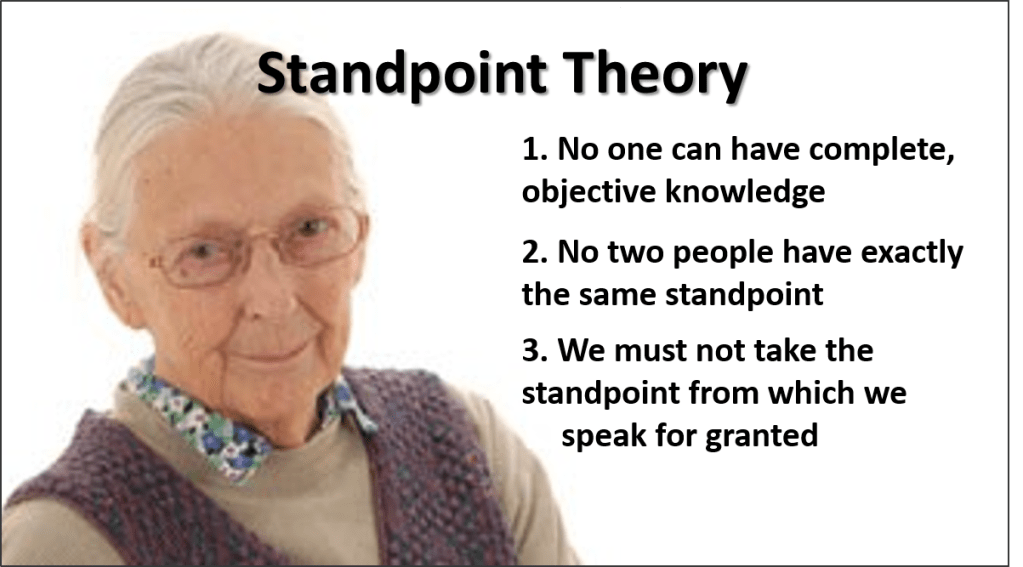 To further this project Smith offer’s what is known as Standpoint Theory. (1) No one can have complete, objective knowledge. (2) no two people have exactly the same standpoint (3) We must not take the standpoint from which we speak for granted. In other words, we must be reflexive of our own social position and cannot impute our own standpoint onto others. If you don’t think that sounds particularly “Theoryish,” you may be right. Smith considered her Standpoint Theory more as a method of inquiry than an explanation of a particular phenomenon. But it does have explanatory value. For instance, we can see examples of women in male dominant professions, say police officers, who participate in the same kind of sexist talk and banter as their male peers. This may not make sense to us from our own standpoint, but if we don’t take our own standpoint for granted we may be able to understand the lived experience of female police officers who must conform to given norms and standards in order to find acceptance and camaraderie in a job that they love.