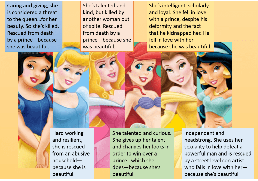 In so flipping the process, Millett created a powerful model for analyzing the cultural influences on women. Now I’m not going to review Millett’s critiques of D. H. Lawrence or Henry Miller…because…you know. D. H. Lawrence and Henry Miller aren’t really household names. But Disney Princesses are! Feminists have used Millett’s model to critique Disney’s Princesses, all of whom, despite many positive qualities, are rescued from hardship by princes based on nothing more than their sexual appeal. As a result of this critique, Disney is trying to develop more dynamic and complex “Princesses” Of course, they are still Princesses.