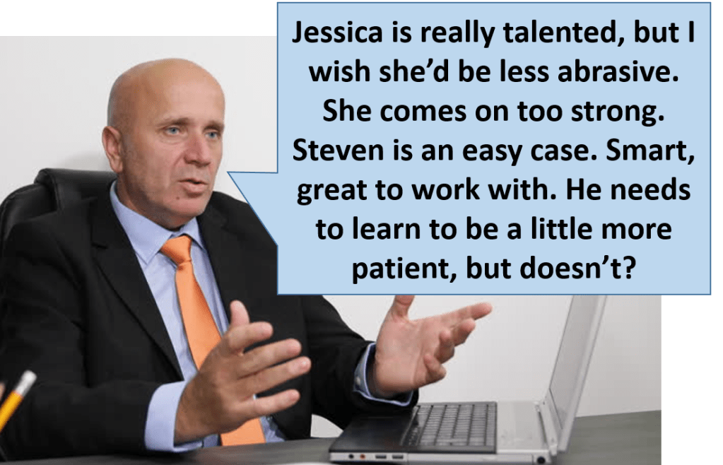 But this also has real life implications. Take, for instance, this statement made by a manager making a promotion selection between two equally qualified candidates quoted in Fortune. “Jessica is really talented,” he said. “But I wish she’d be less abrasive. She comes on too strong.” Her male counterpart? “Steve is an easy case,” he went on. “Smart and great to work with. He needs to learn to be a little more patient, but who doesn’t?”