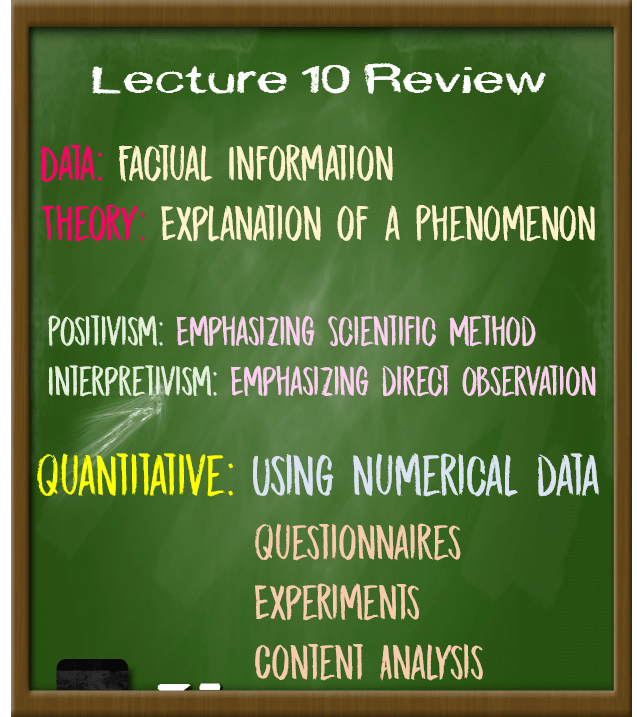 Lecture 10 focused on the Positivist Tradition which emphasizes using deductive scientific methods for understanding social life. To do so, sociologists use what are called quantitative methods of research, or methods of research using numerical data and measurable variables. We then learned about three different methods of research, questionnaires, experiments, and content analysis, and reviewed their strengths and weaknesses.