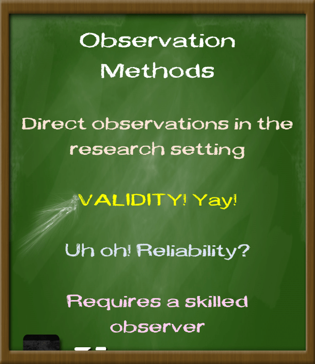 The next major method of qualitative research is observation, in which the researcher goes into a research setting and observes the interactions. Again, the researcher is looking for patterns from which he can understand the lived experience and how people attach meanings to their lives. This is a great way to get valid data, as the researcher is directly witnessing and recording what’s going on. Reliability becomes more of an issue, however, because it’s hard to reproduce the research in a different setting, and all observations, even by a trained researcher, are subject to interpretation. That’s why observation techniques require a highly trained observer who can ground his observations in sound social theory. It also helps if he can support his observations with more empirical quantitative data.