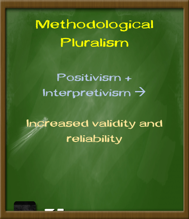 Case studies using multiple kinds of research is an example of Methodological Pluralism. Methodological Pluralism combines research methodologies like positivism and interpretivism in complementary ways to improve validity and reliability. If we look at Quantitative Methods as having high reliability but relatively low validity, and qualitative methods as being valid, but of relatively low reliability, then how do you, as a researcher, maximize the validity and reliability of your research? Well, you could combine quantitative and qualitative methods.