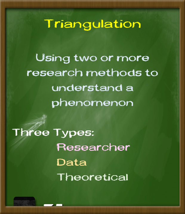 There are three different kinds of triangulation: Researcher Triangulation happens when multiple researchers using the same research methods in the same settings. Ideally, the researchers should represent different ethnic, age, gender and class groups to control for subjective influences or biases. Data Triangulation uses multiple sampling strategies to collect data. Again, those areas of agreement between multiple samples are more likely to be reliable and valid. Finally, there’s Theoretical Triangulation in which the same research setting and focus is looked at using different theoretical perspectives. After all, if methods are subject to bias, so are theories.