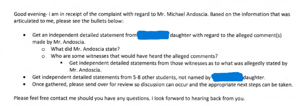 You may have noticed that nowhere in these directions did the director suggest that someone should get my side of the story. Indeed, of all the communications in the packet I received from public records2 not a single person from the Superintendent on down to any of my school administrators suggest that someone should talk to me about what happened that day. At least they didn’t put it in writing. If it was suggested, it’s not in the recorded.