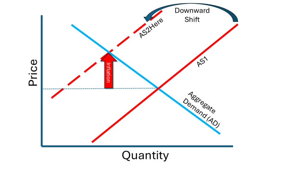 Here we can see an example of a reduction in supply represented by a downward (leftward) Shift in the Aggregate Supply Curve from AS1 to AS2.4