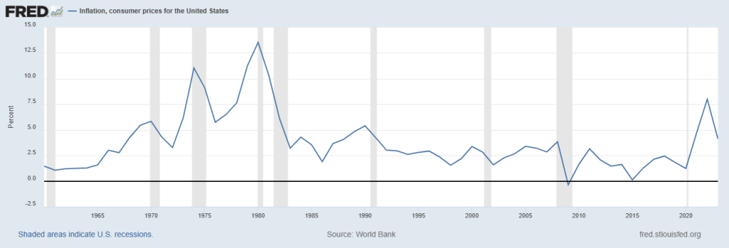 Under normal circumstances inflation is manageable. Here’s a breakdown of U.S. Inflation since 1960 that I got from the Federal Reserve Economic Database (FRED)5