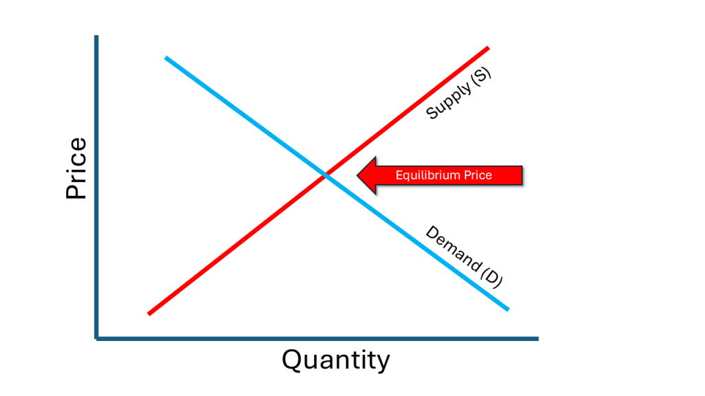 A supply and demand curve shows the relationship between the price of a good or service and the quantity desired at a given price. The blue line is the Demand Curve, represented by a downwardly slopping line (Inversely proportional, or negative slope for the math geeks). We know this is a Demand Curve because we all demand/want stuff, but the more expensive it becomes, the less we want it (Law of Demand), hence it slopes downward, representing the quantity desired increasing as the price decreases. The red line is the Supply Curve. It’s the opposite because it comes from the point of view of the person supplying the good or service. In that case, the higher the price for a given good or service, the more likely I am to want to supply it (Law of Supply). Hence, the line is sloping up (Directly proportional, or positive slope). Obviously, as the demander, I optimally want the good or service for free! As a supplier, I want to sell the good or service for a bagillion dollars! Since neither of those things are going to happen, we have to compromise. Where the demand curve meets the supply curve, that’s the Equilibrium Price. In other words, this is the price by which I as the supplier will sell all of my goods and services that I’m willing to sell at that price, and everyone who wants that good or service at that price will get it. If, for instance, I’m selling hamburgers, at the equilibrium price everyone who wants burgers at that price will be satisfied, and I will have no hamburgers left over. Everybody is happy1.