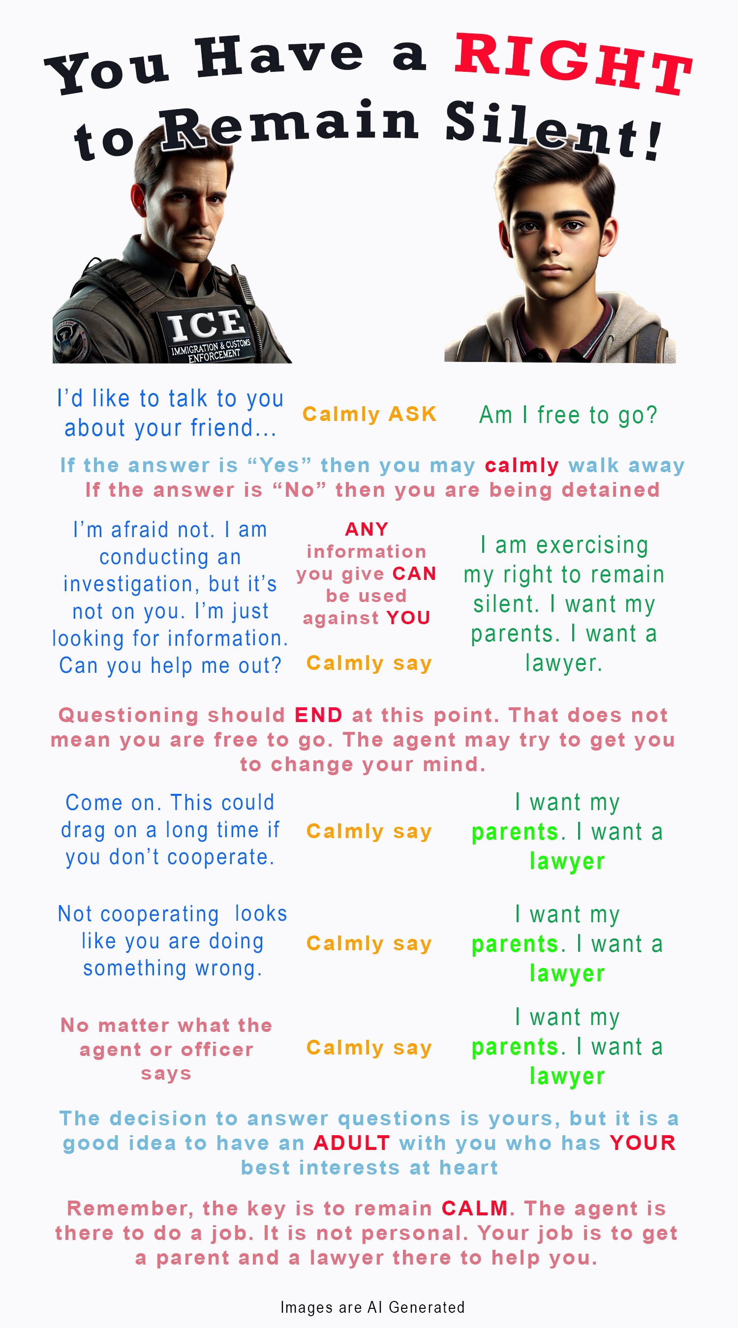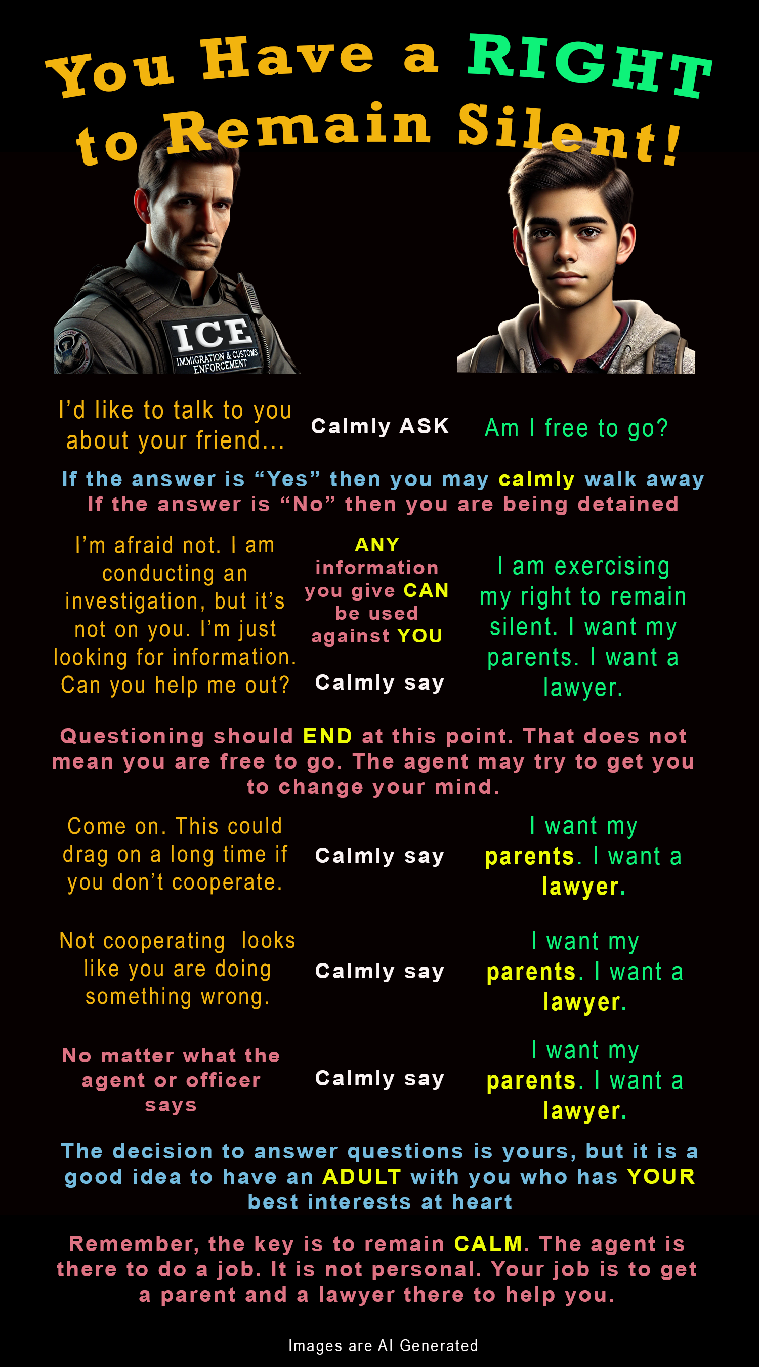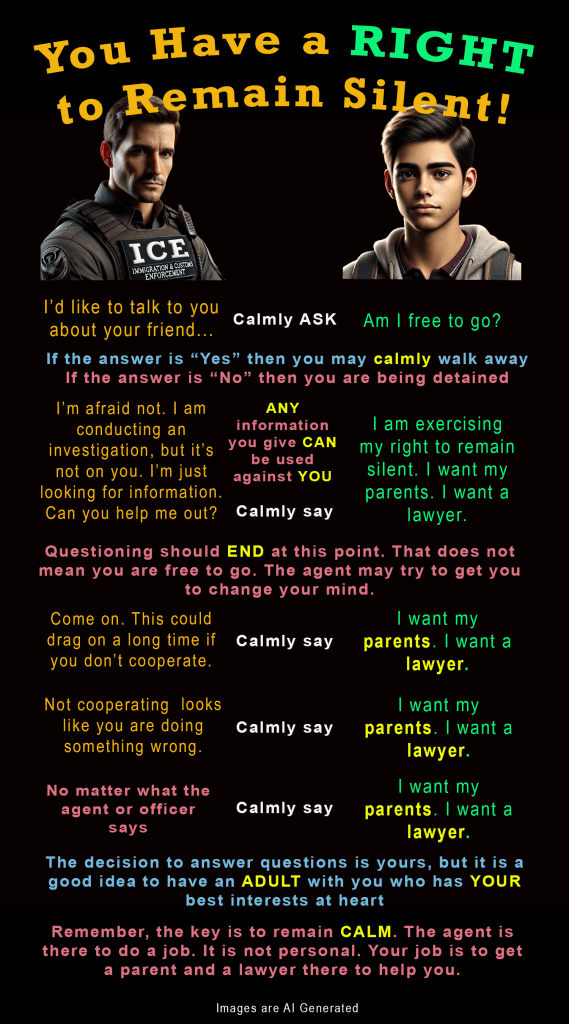 Below is a PNG that can be downloaded and made into cards that can be given out to young people. It is in English. I have Spanish, Haitian Creole, and Brazilian Portuguese versions coming soon. Please feel free to use these images and pass them around. Share this post with your teacher friends as well as any young person who looks like or associates with those who look like they may be subject to ICE interrogation. Parents, please use these images to help your child practice the scripts. The more people practice the script, the easier it is to remain calm and use it when the time comes.