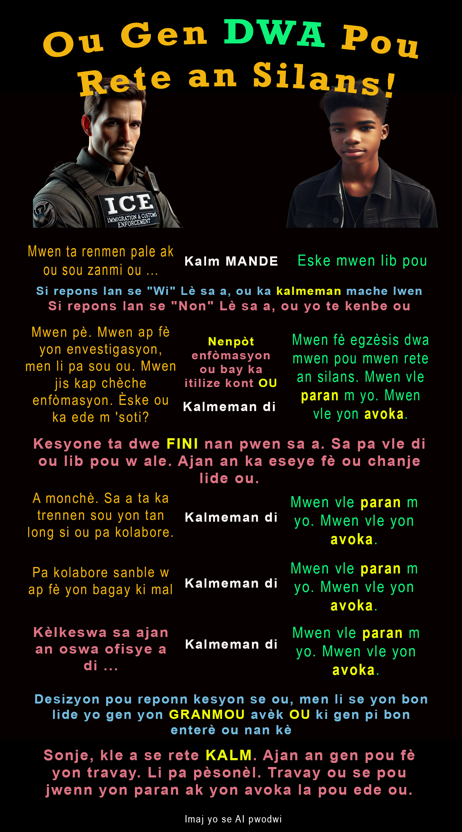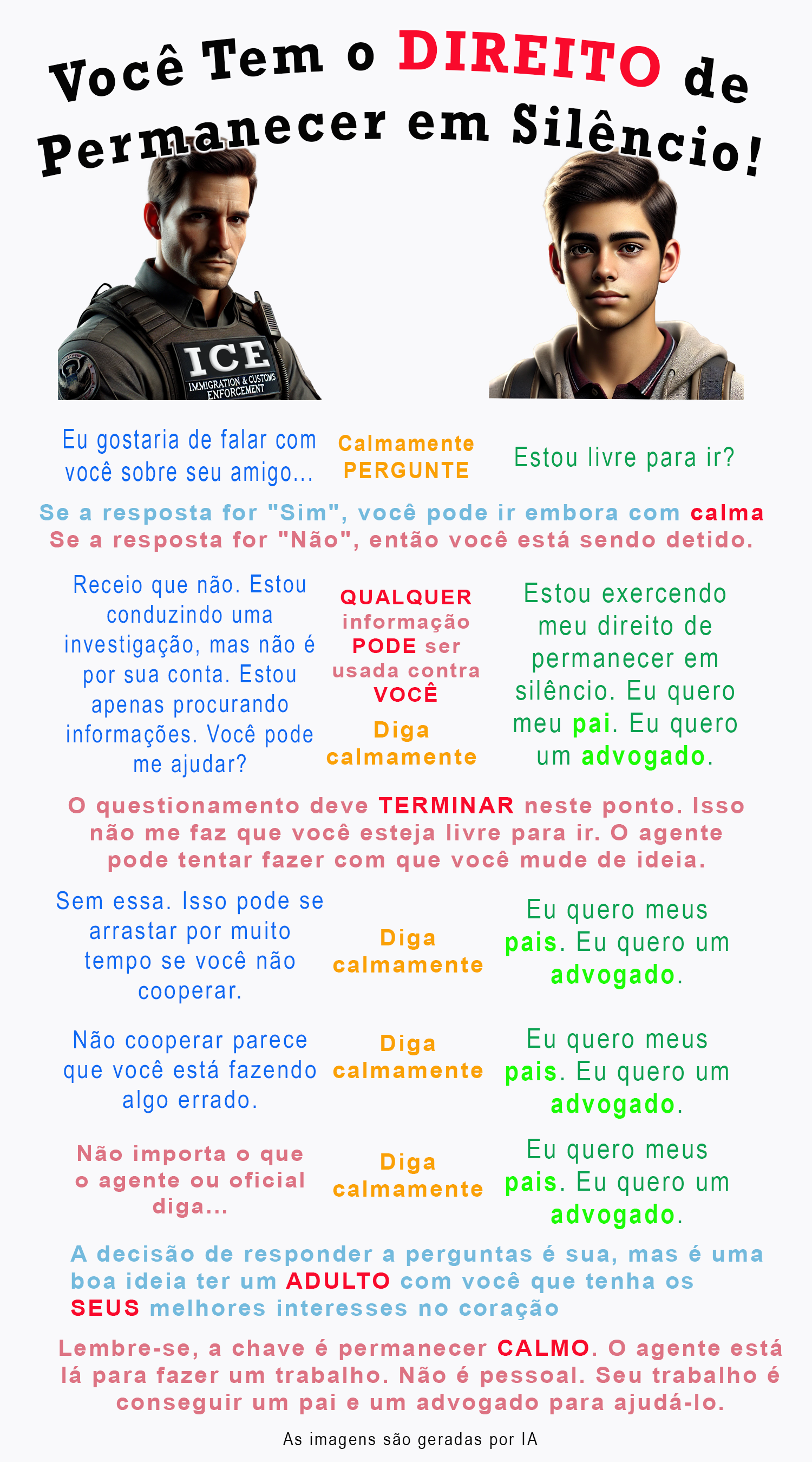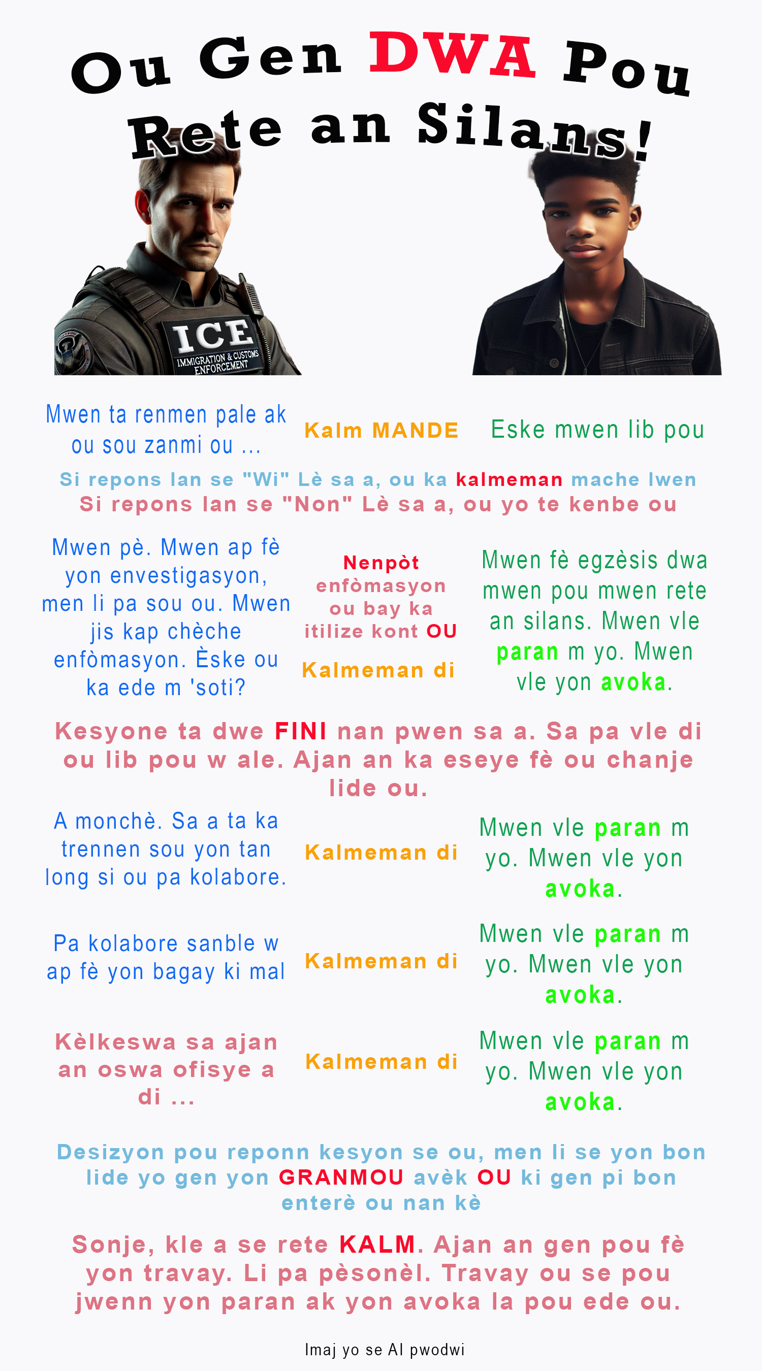 Below is a PNG that can be downloaded and made into cards that can be given out to young people. It is in English. I have Spanish, Haitian Creole, and Brazilian Portuguese versions coming soon. Please feel free to use these images and pass them around. Share this post with your teacher friends as well as any young person who looks like or associates with those who look like they may be subject to ICE interrogation. Parents, please use these images to help your child practice the scripts. The more people practice the script, the easier it is to remain calm and use it when the time comes.